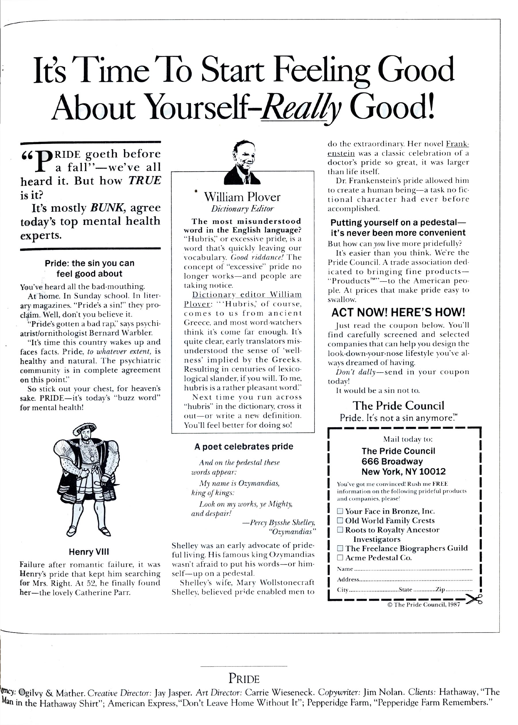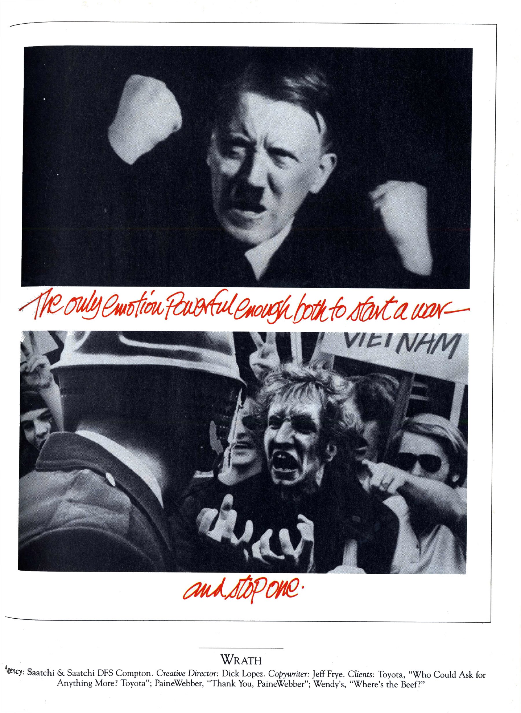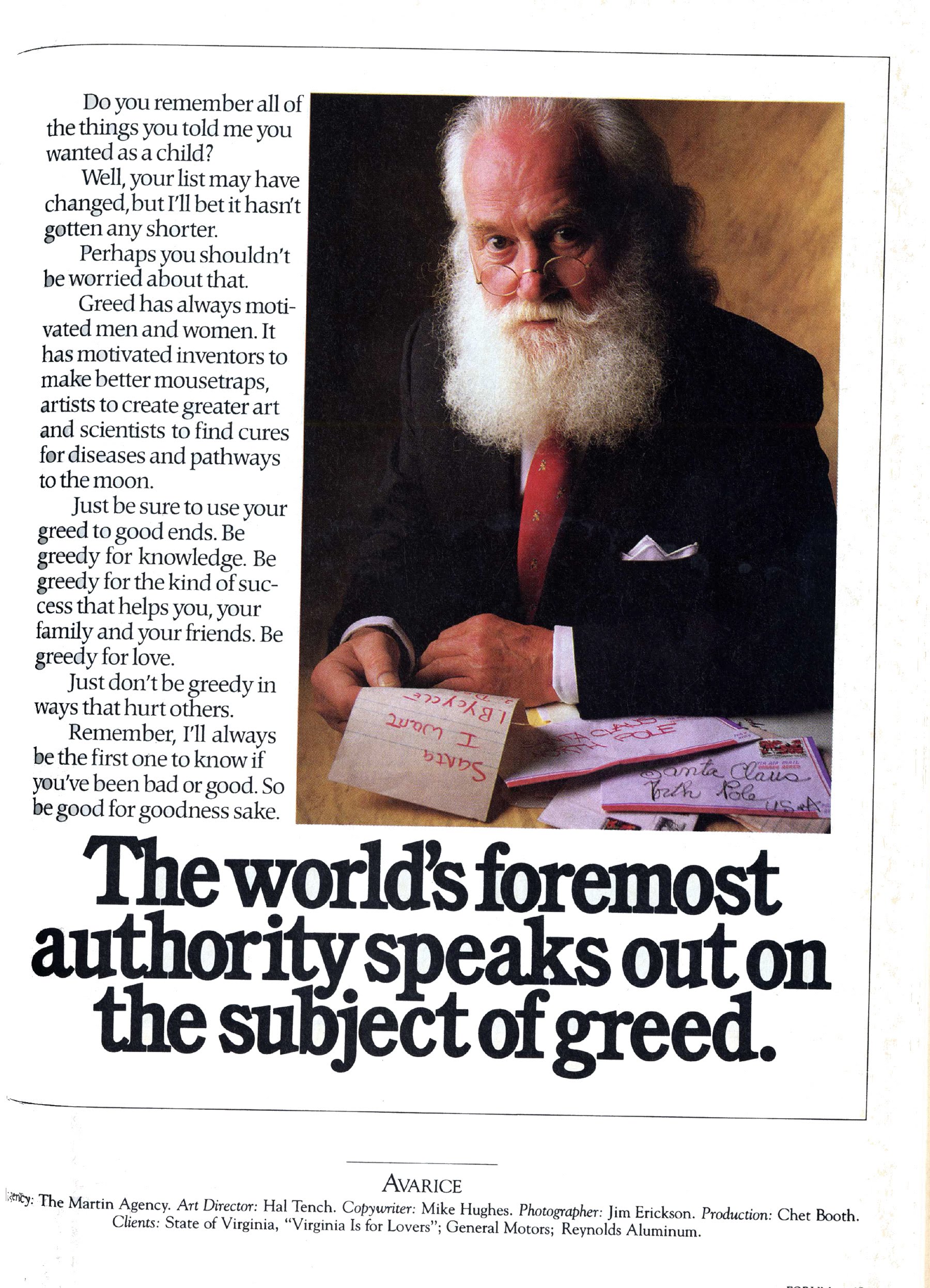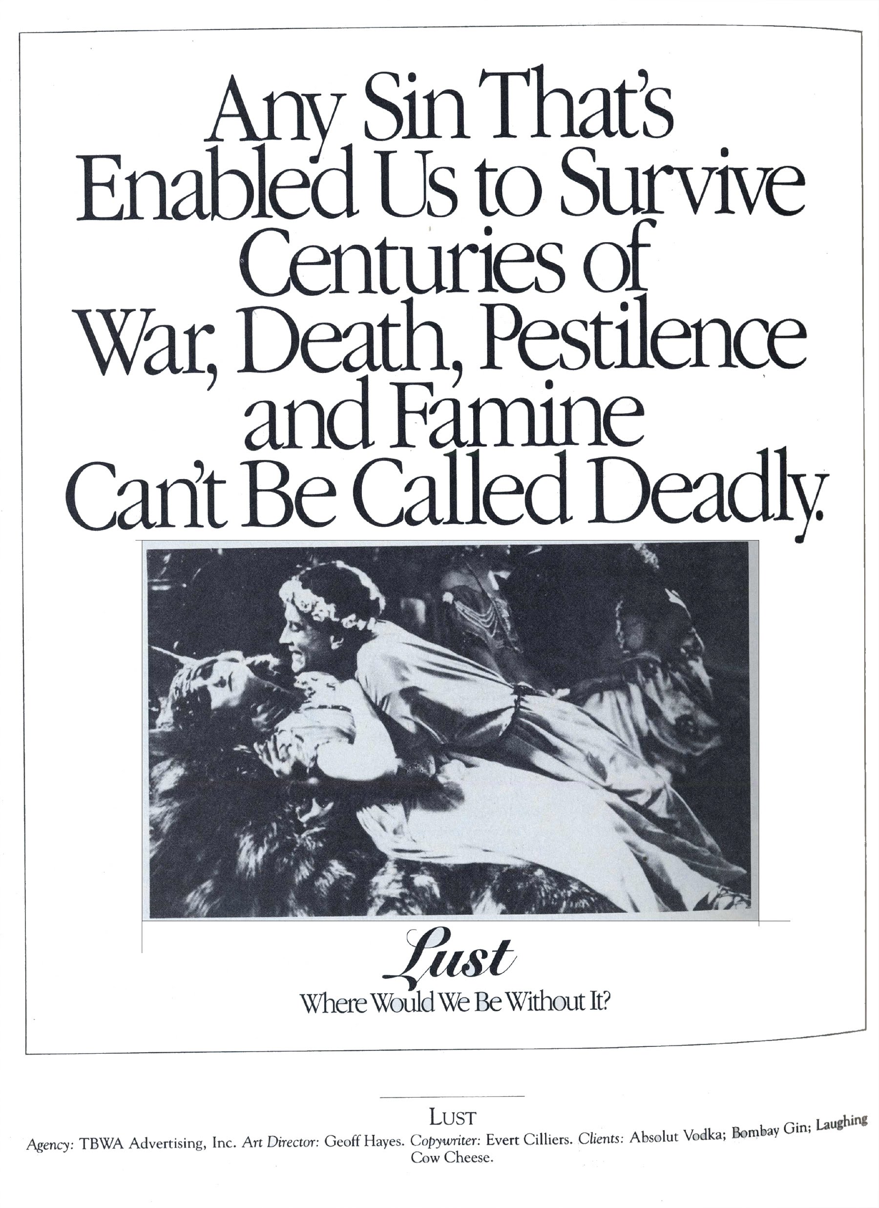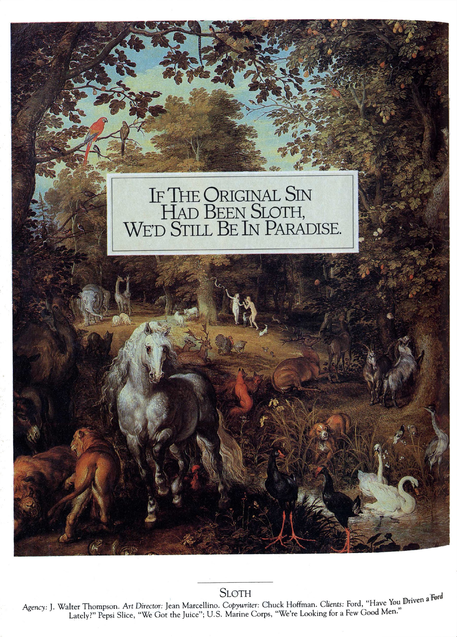 So in 1987, Harper's Magazine, recognizing the lure of these temptations, asked leading Madison Avenue advertising firms to develop ad campaigns promoting the Seven Deadly Sins. The images they came up with are below.