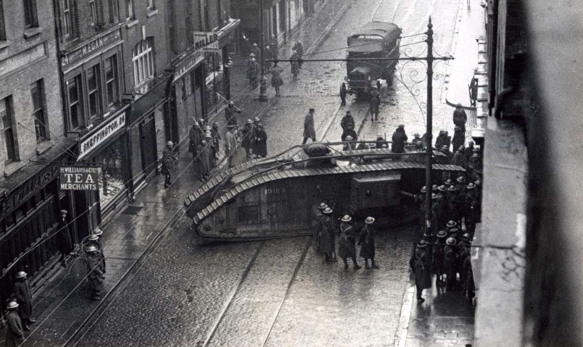 An English tank patrols the street during an uprising in Dublin, in 1921.