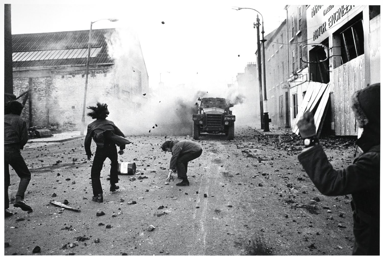 Rocks against armored Saracens (armored personnel carriers)