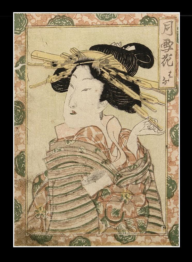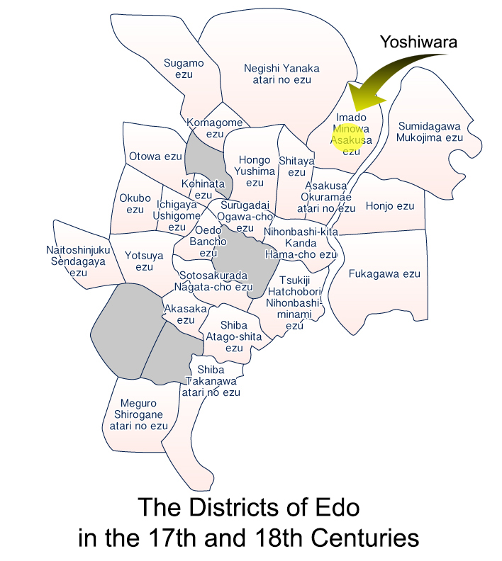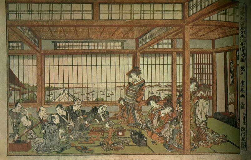 So Hideyoshi decided to conslidate all this vice in one spot. He took a large tract of land north of the city—accessible only by canal, which was called "Good Luck Meadow," or, in Japanese—Yoshiwara. He had the remainder of the tract enclosed by a moat, so that the only access was by water. This was done to keep minors and criminals out (and the sex workers in). Visitors got the impression that the whole area was an island, and called it "The Floating World". The term applied not only to the geography of the place, but to the floating feeling one has when in the throes of sexual satisfaction.