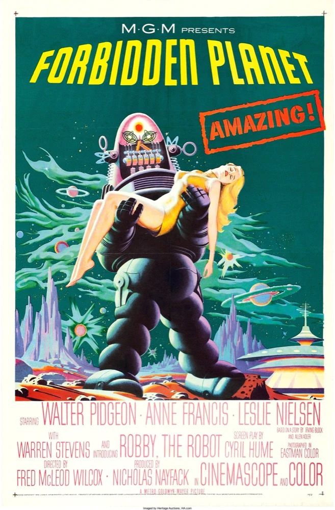 But arguably most important of all in the history of science fiction going forward was one film called Forbidden Planet (1956). Adapted from the Shakespeare play The Tempest, Forbidden Planet stars Leslie Nielsen (yes, the same one from Airplane!) as a space explorer with a crew of scientists who uncover a strange, new world, and, along the way, seek out new life and civilizations.