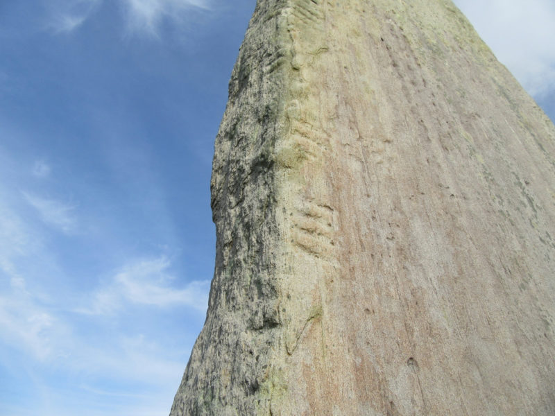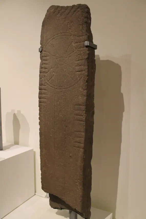 The Maltese cross in the center was carved before the ogham inscription (the ogham lies over the cross, and not vice-versa). |