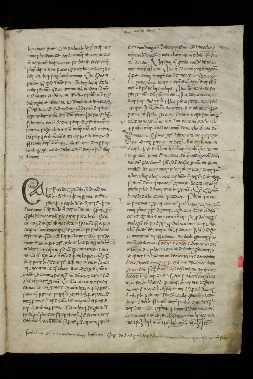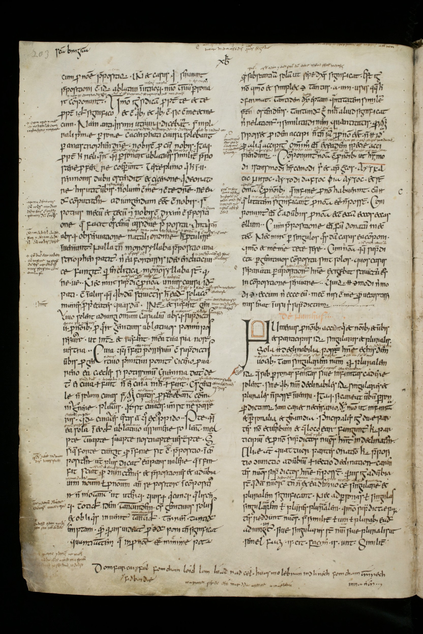 Perhaps the most famous source for material of this kind in Irish is a mid-9th-century manuscript in the Stiftsbibliothek of St. Gallen in Switzerland, known as Codex Sangallensis 904. It contains a copy of Priscian’s Institutiones Grammaticae (6th century), one of the most important sources for the instruction of Latin in the Middle Ages. This ms is simply known as "The St. Gall Glosses." The main text is written in large script, but between the lines and in the margins are much smaller annotations, explanations, and comments, written in Latin and in Old Irish. Mostly these are explanatory teaching notes, but in the margins of folios 203 and 204 is a gloss considered one of the highlights of medieval Irish nature poetry.
