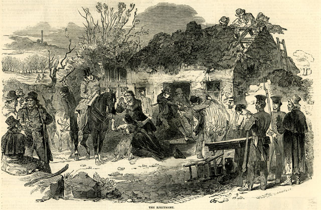 During the worst months of the famine, in the winter of 1846-47, tens of thousands of tenants fell in arrears of rent and were evicted from their homes. A nationwide system of ousting the peasantry began to set in, with absentee landlords,and some resident landlords as well, more determined than ever to rid Ireland of its "surplus" Irish. In 1850 alone, over 104,000 people were evicted.